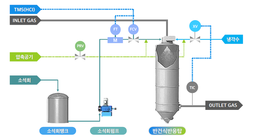 °Ç½Ä ¹ÝÀÀžÀº Æó±â¹° ¿¬¼Ò ÈÄ ¹èÃâµÇ´Â ¿¬¼Ò °¡½º ÁßÀÇ »ê¼º°¡½º¸¦ °Ç½ÄÀ¸·Î ó¸®ÇÏ´Â °øÁ¤À¸·Î¼­ ü·ù ½Ã°£ È®º¸¸¦ À§ÇØ ±¸¼ºÇÑ °Ç½Ä ¹ÝÀÀžÀÇ Àü´Ü¿¡ ºÐ¸» »óÅÂÀÇ ¹ÝÀÀÁ¦ ºÐ¸» ¼Ò¼®È¸ ¶Ç´Â Áßź»ê³ªÆ®·ýÀ» ÅõÀÔÇÏ¿© »ê¼º°¡½º(SOx , HCl & HF)¸¦ Èí¼ö ¹ÝÀÀ½ÃÄÑ ÈÄ ¹ÝÀÀ ºÎ»ê¹°À» ÈÄ´Ü ¿©°úÁýÁø±â¿¡¼­ Æ÷ÁýÇÏ¿© »ê¼º°¡½º¸¦ ó¸®ÇÏ°Ô µË´Ï´Ù . ÀϹÝÀûÀ¸·Î ¹Ý°Ç½Ä ¹ÝÀÀž ´ëºñ »ê¼º°¡½º Á¦°ÅÈ¿À²Àº ³·À¸³ª , ¿¬¼Ò°¡½º ¿ÂµµÀÇ ÀúÇÏ´Â »ó´ëÀûÀ¸·Î Àû½À´Ï´Ù .