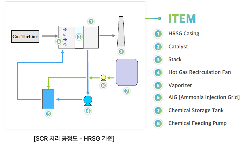 Ȳ¿¬À» Àú°¨Çϱâ À§Çؼ­´Â Áõ¹ß±â ³»¿¡¼­ ¾×»ó¿¡¼­ ±â»óÀ¸·Î Áõ¹ßµÈ ȯ¿øÁ¦(¿¡Åº¿Ã °èÅë)´Â ¼øÈ¯ ¹è±â°¡½º¿Í È¥ÇÕµÈ ÈÄ HRSG ³»ºÎ ÀÇ RAIG ¸¦ ÅëÇØ ºÐ»ç Çϰųª, ¹ÝÀÀÁ¦¸¦ °¡½ºÅͺó Ãⱸ Á÷ÈÄ HRSG Inlet Duct ÀÇ °í¿ÂºÎ¿¡ ³ëÁñÀ» ÅëÇØ Á÷Á¢ ºÐ»çÇÏ¿© NO2¸¦ NO·Î ÀüȯÇÏ¿© Ȳ¿¬ (Yellow Plume)À» Àú°¨ ÇÕ´Ï´Ù.